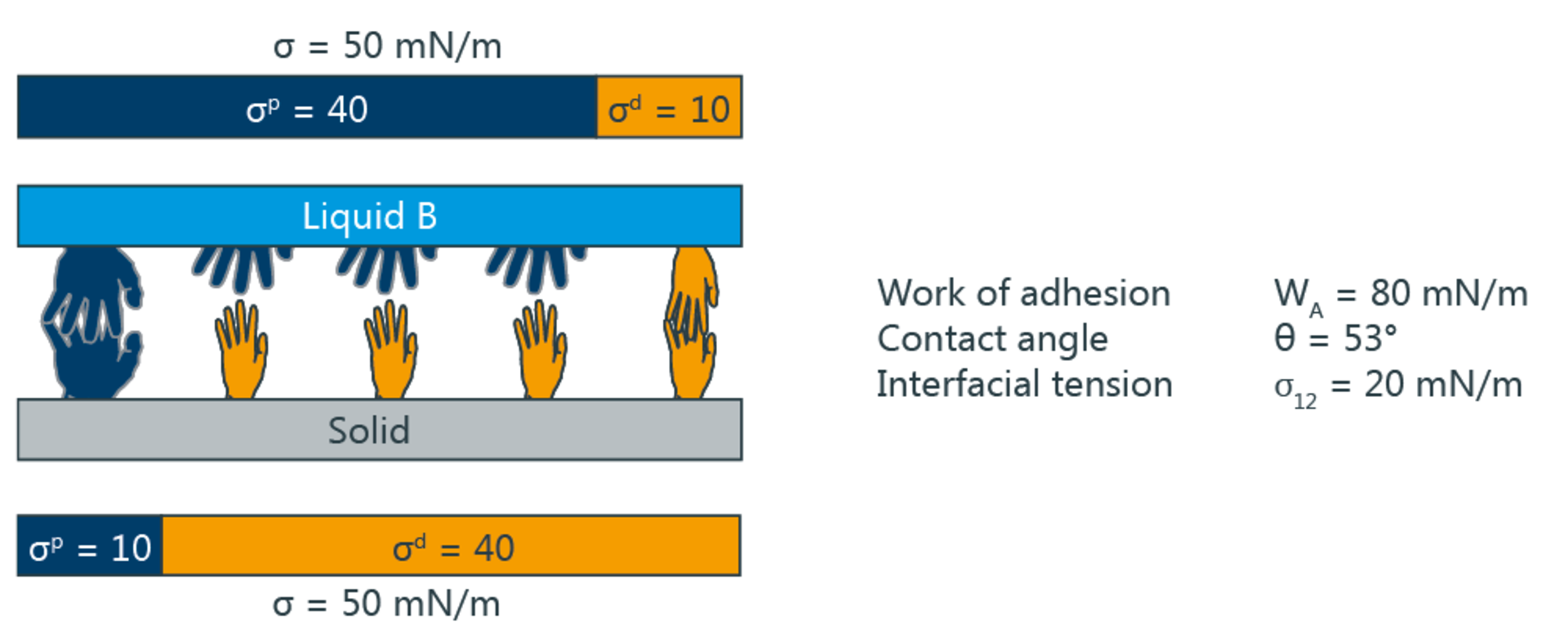 Hình minh họa sau đây cho thấy độ thấm ướt và độ bám dính tùy thuộc vào các phân số phân cực và phân tán. Các bàn tay lớn tượng trưng cho các tương tác phân cực, các tương tác phân tán nhỏ. Trong hình trên, các tương tác giống hệt nhau, dẫn đến độ bám dính tối đa và góc tiếp xúc là 0°. Dưới đây là một ví dụ với các thành phần tương tác không giống hệt nhau.