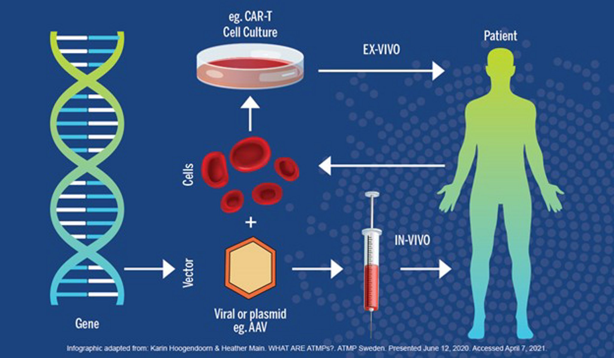 GTMP có thể được sử dụng ex-vivo hoặc in-vivo, mô tả đơn giản nơi diễn ra thao tác di truyền. Trong liệu pháp gen ex-vivo, các tế bào mục tiêu được lấy ra khỏi bệnh nhân, liệu pháp gen được sử dụng cho các tế bào, sau đó các tế bào được đưa trở lại cơ thể bệnh nhân. Một ví dụ về GTMP ex-vivo là liệu pháp CAR T, trong đó các tế bào miễn dịch được thao tác để tấn công các tế bào ung thư và sau đó được tiêm lại vào bệnh nhân, tại đó chúng giúp chống lại ung thư. Với liệu pháp gen in-vivo , liệu pháp được sử dụng trực tiếp cho bệnh nhân mà không cần thao tác các tế bào bên ngoài cơ thể. Ví dụ, một phương pháp điều trị thử nghiệm in-vivo cho bệnh mù di truyền đã được phát triển để loại bỏ đột biến có hại khỏi các tế bào trong võng mạc của bệnh nhân.