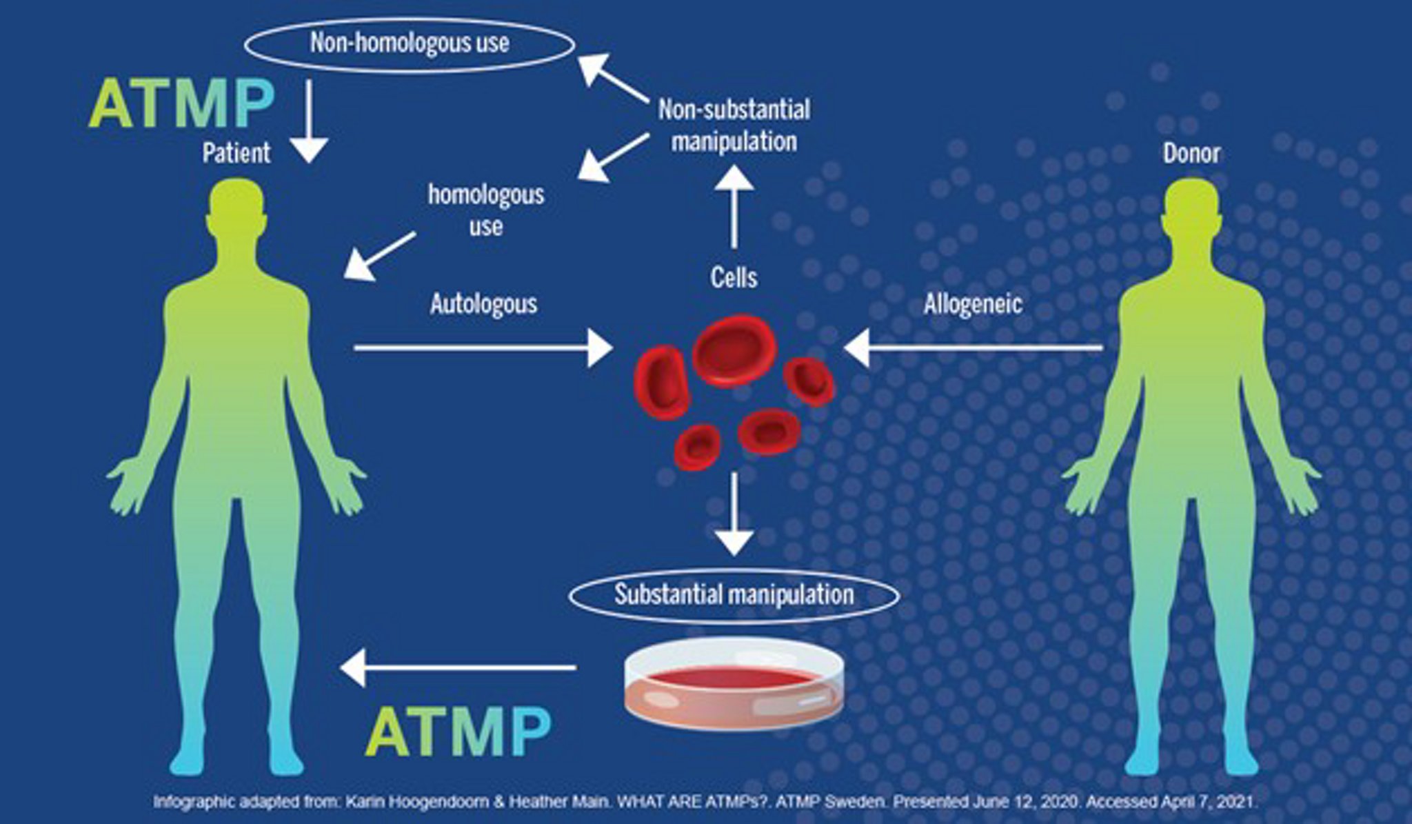 Với các ca ghép truyền thống, các tế bào không bị can thiệp đáng kể trước khi vào cơ thể và thường được sử dụng cho cùng một chức năng thiết yếu mà chúng phục vụ ở người hiến tặng. Để đủ điều kiện là sCTMP, tế bào hoặc mô phải được xử lý hoặc thao tác theo cách sẽ thay đổi hành vi của chúng khi được đưa vào bệnh nhân. Cùng một tế bào có thể là ATMP trong một bối cảnh, không thuộc bối cảnh khác—ví dụ, việc ghép tủy xương từ người hiến tặng cho bệnh nhân sẽ không phải là ATMP nếu tủy xương phục vụ cùng một chức năng ở bệnh nhân. Tuy nhiên, việc áp dụng tế bào gốc tủy xương vào tim của bệnh nhân để giúp chữa mô bị tổn thương sau cơn đau tim sẽ được xem là ATMP vì nó phục vụ một mục đích khác so với mục đích ở người hiến tặng.